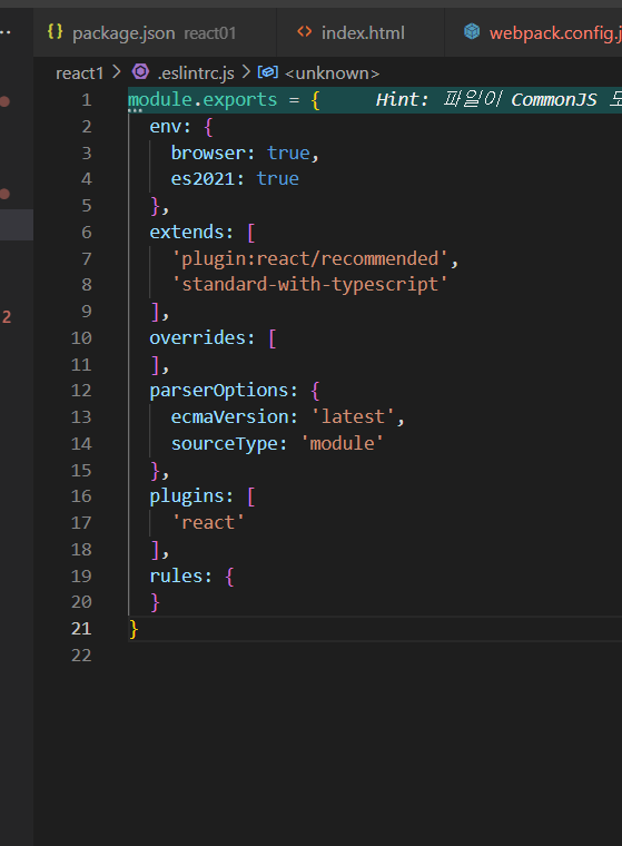 위 진행시 .eslintrc.js 안의 내용은 다음과 같다.