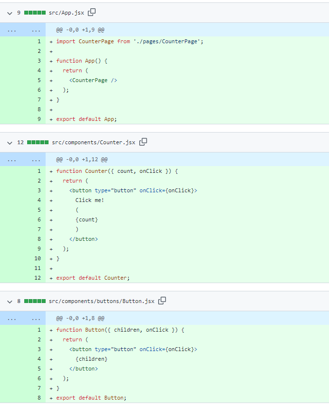 만약 하나의 파일에 모든 컴포넌트가 있으면, 내가 카운터를 고치고 싶어도 index.js를 수정하고 버튼을 수정하고 싶어도 index.js파일에 접근해야 하니 불편하겠죠? 그리고 코드가 너무 길어서 내가 보고 싶은 코드가 어디 있는지 찾기도 어렵습니다!