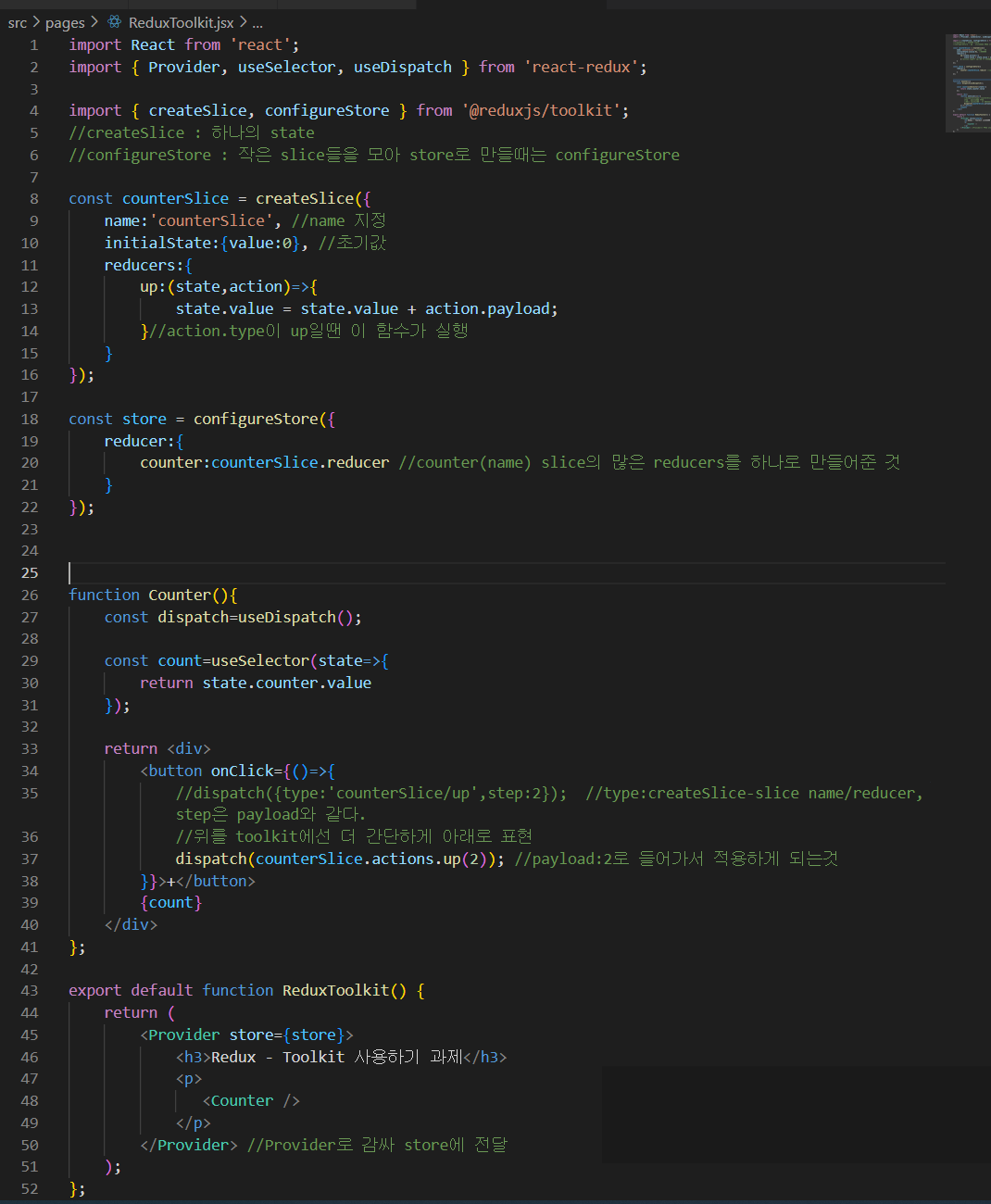 ex) dispatch(slice이름.actions.전달값(2)); 이런식으로 간단하게 표현가능