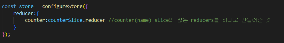 counter:counterSlice.reducer //counter(name) slice의 많은 reducers를 하나로 만들어준 것