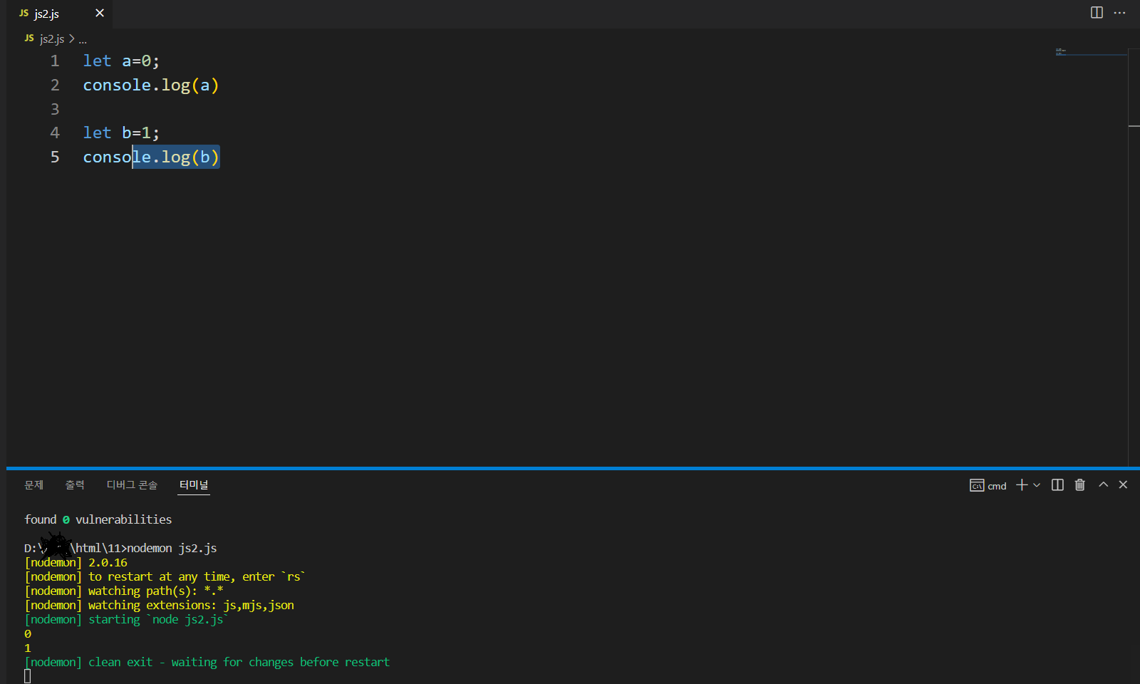 2. 터미널에 다시 nodemon js2.js치면 값이 아래에 뜬다.