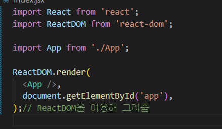 원인: CRA 를 통해 만들지 않아 index.jsx 코드 작성시 잘못된 코드로 인해 root 설정에 오류가 있었다.