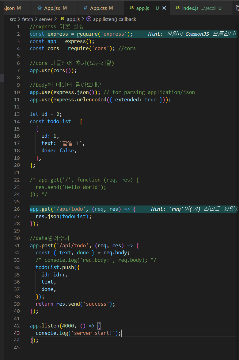 >데이터를 줄지말지는 server가 정하는 것이기 때문에 origin이 달라도 데이터를 꺼내갈수 있다고 정해주는건 server에서 정해야한다.>쉽게해주는 라이브러리: npm 에서 cors 검색