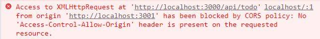 | Access to XMLHttpRequest at 'http://localhost:3000/api/todo' from origin 'http://localhost:3001' has been blocked by CORS policy: No 'Access-Control-Allow-Origin' header is present on the requested resource. |