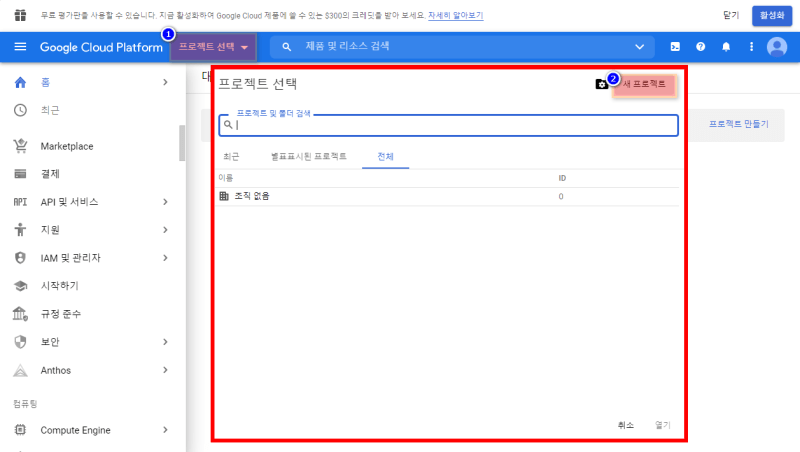 상단의 “프로젝트 선택”을 클릭 후 나타나는 “프로젝트 선택”팝업에서 “새 프로젝트”를 클릭 해 주세요.
