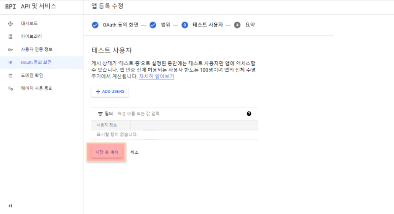 “테스트 사용자” 페이지에서는 만약 소셜로그인 테스트를 위해 테스트가 필요하면 소셜 로그인을 사용할 테스트 사용자를 등록 해 주세요. 저는 바로 서비스를 개시할 목적이므로 테스트 사용자 없이 진행하도록 하겠습니다.