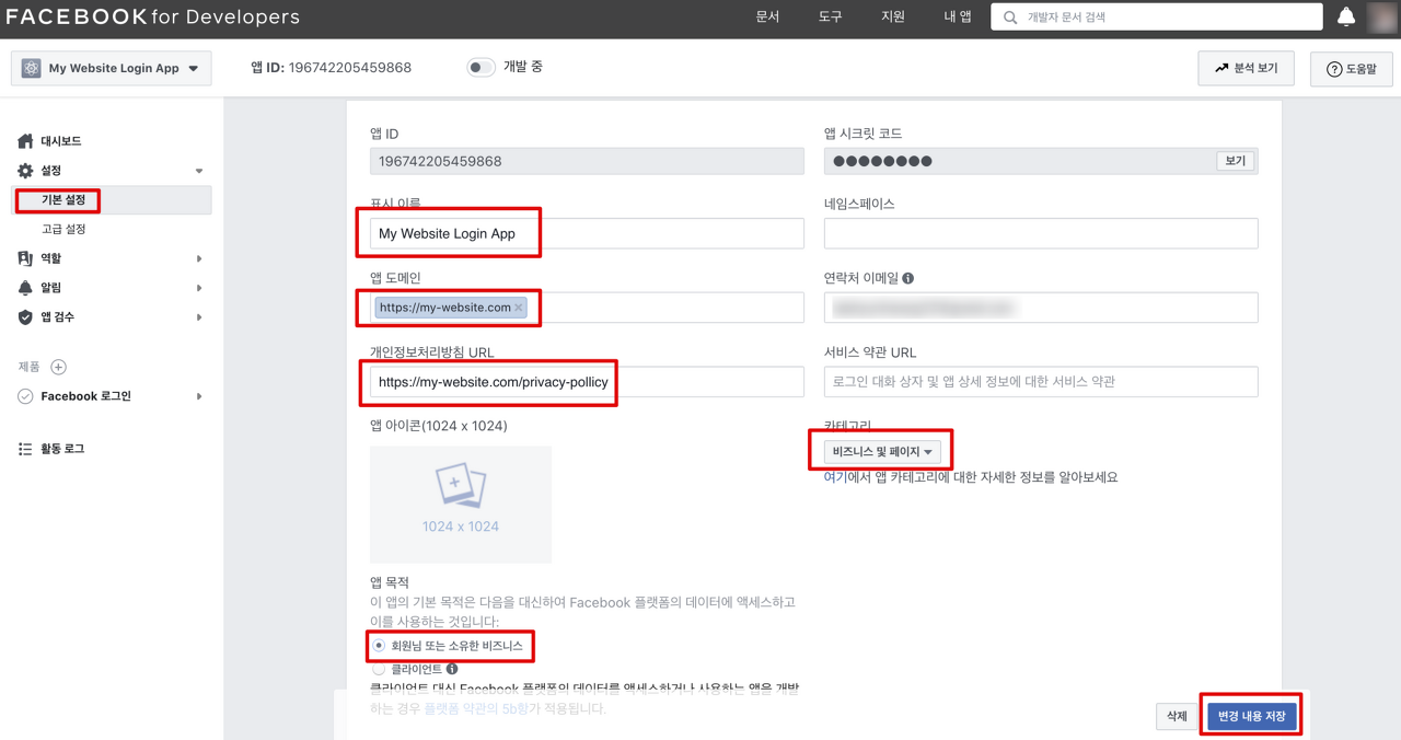 앱도메인 필드에 자신의 사이트 주소를 https:// 또는 http://까지 포함해서 입력합니다.