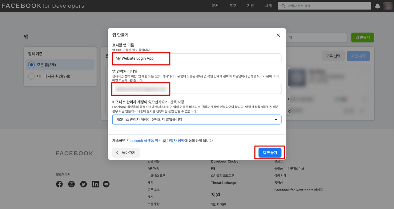 표시할 앱이름과 앱 연락처 이메일을 입력하고 “앱 만들기” 버튼을 클릭합니다.