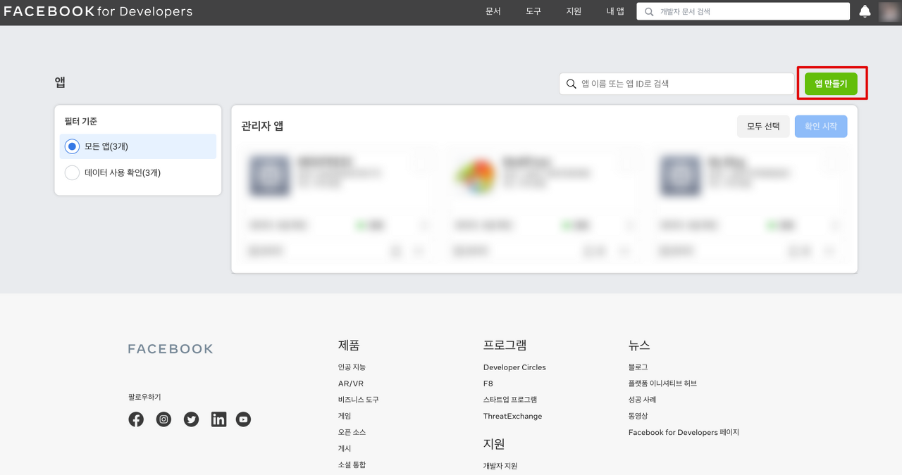 그 첫번째로 먼저 페이스북의 API key를 발급받아 보도록 합니다.