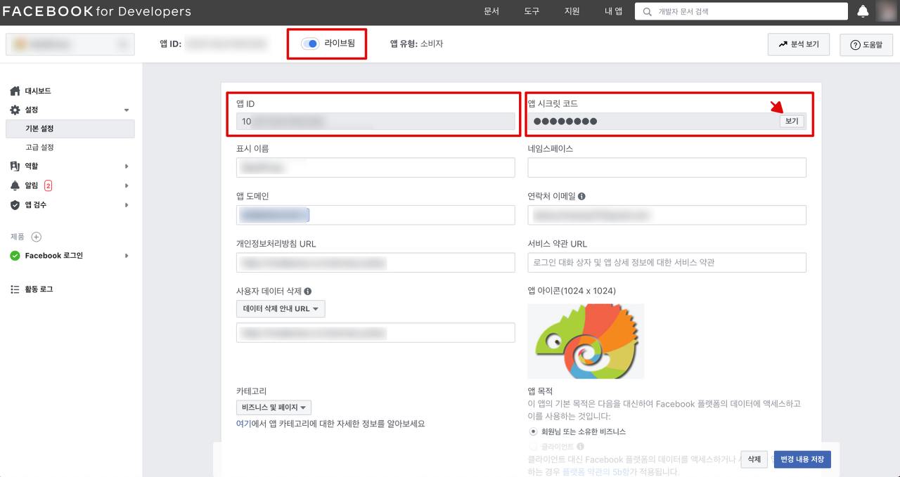 마지막으로 “설정” 메뉴 – “기본설정”을 클릭하고, “앱ID(AppID)“와 “앱 시크릿 코드(App secret)“를 복사해서 워드프레스 소셜로그인 플러그인의 페이스북 셋팅에 입력합니다. 앱 시크릿 코드는 우측에 “보기(Show)” 버튼을 클릭해야 보이게 됩니다.