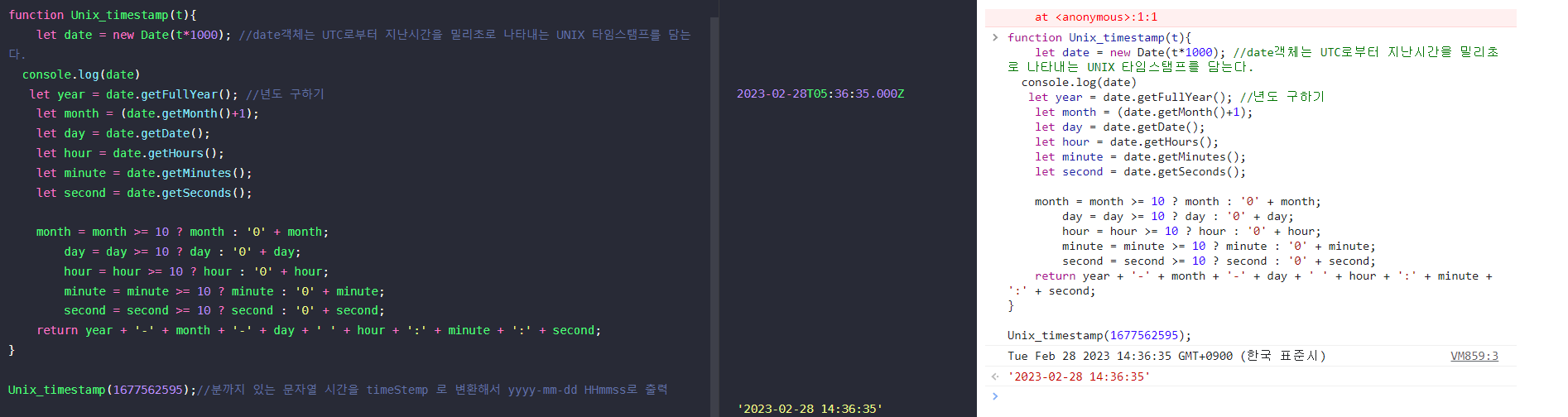 =>>new Date는 인자, 메서드에 따라 값이 달라질 수 있는데 (UTC or 현지시간) 서버에서 시간을 넘겨줄 때 그에 따른 코드 작성이 필요하다. 위에 내가 사용한 방법에서는 UTC기반인 유닉스타임을(1677562595) 이용해서 인자 t로 넣었으며, .getFullYear(), getMonth() ... 와 같은 현지시간을 구하는 메서드를 이용했기 때문에 현지시간 값이 출력되도록 계산이 된 것이다.
