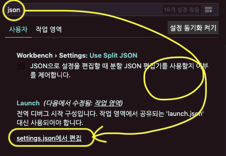 2. 설정 검색란에 json이라고 치고 settings.json에서 편집으로 들어가 준다.