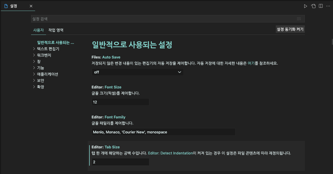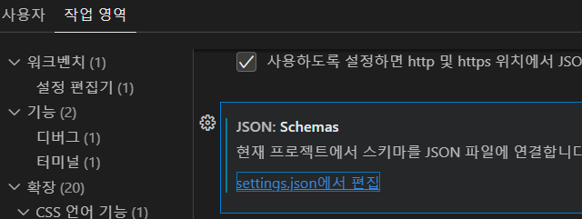 아까는 사용자에서 지정했어서, 작업 영역 탭을 눌러 해당 setting.json파일을 열었다.