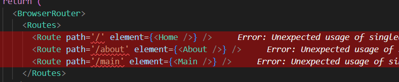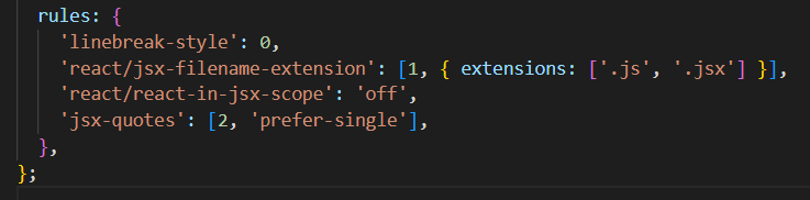 module.exports = { env: { browser: true, es2021: true, }, extends: ['plugin:react/recommended', 'airbnb'], overrides: [], parserOptions: { ecmaVersion: 'latest', sourceType: 'module', }, plugins: ['react'], rules: { 'linebreak-style': 0, 'react/jsx-filename-extension': [1, { extensions: ['.js', '.jsx'] }], 'react/react-in-jsx-scope': 'off', //import react생략하기 위한 작업(아래설명 참고) 'jsx-quotes': ['error', 'prefer-single'], //안할 시 Unexpected usage of singlequote 오류 발생 }, }; - npx eslint --init
