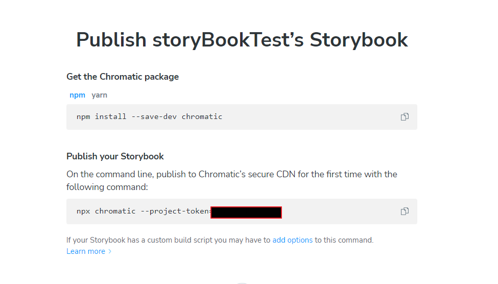 프로젝트를 위해 생성된 고유한 project-token을 복사해주세요. 그런 다음 스토리북을 빌드(build)하고 배포하기 위해 아래 명령어를 실행해주세요. 여러분의 토큰으로 project-token 부분을 꼭 바꿔주세요.