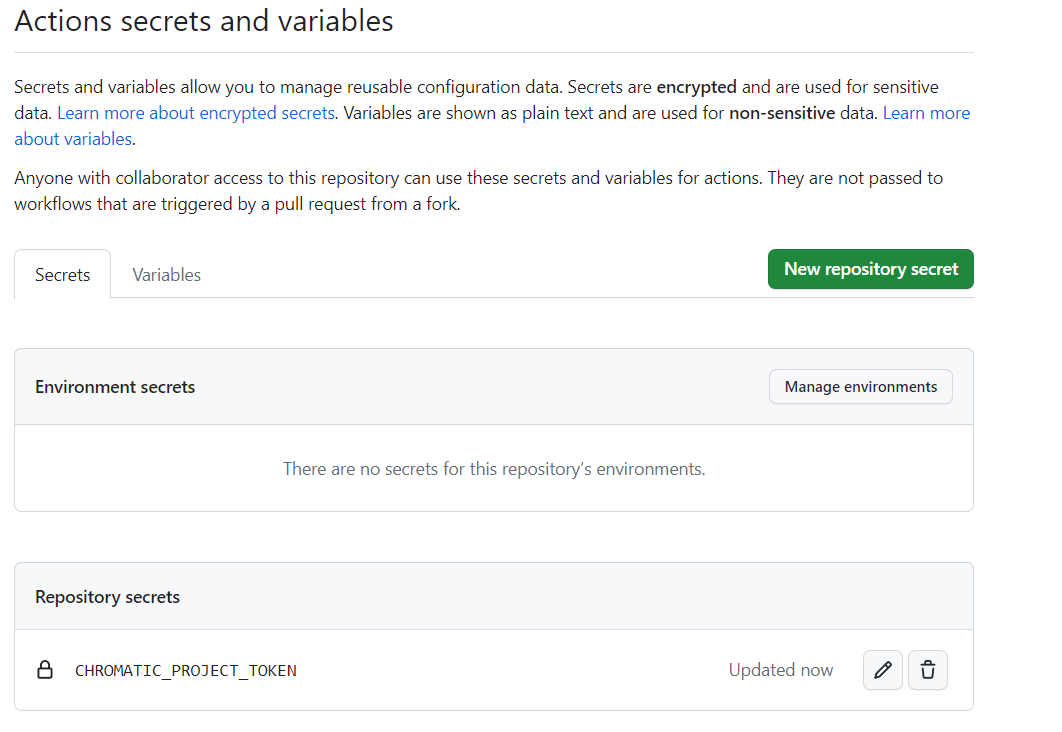 들어간 후 아래 초록버튼 클릭 후 CHROMATIC_PROJECT_TOKEN 쓴 후 아래에 토큰값을 넣으면 아래와 같이 생성됨