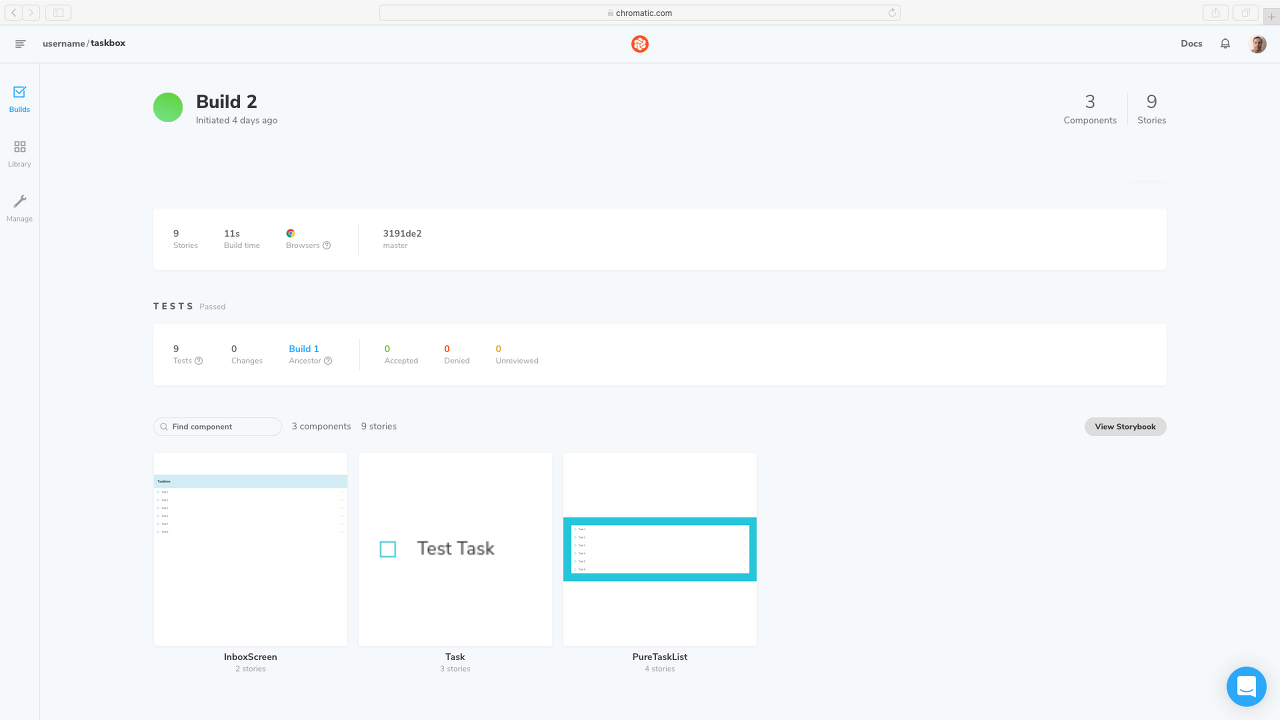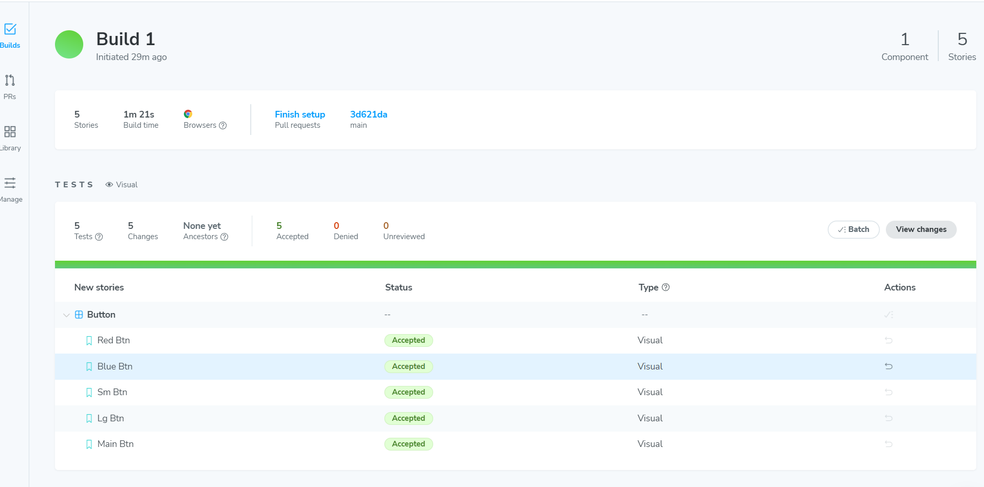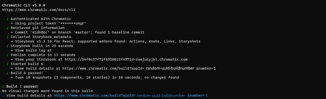 완료되면 배포된 스토리북의 https://random-uuid.chromatic.com링크를 받으실 것입니다. 해당 링크를 팀과 공유하여 피드백을 받으세요.