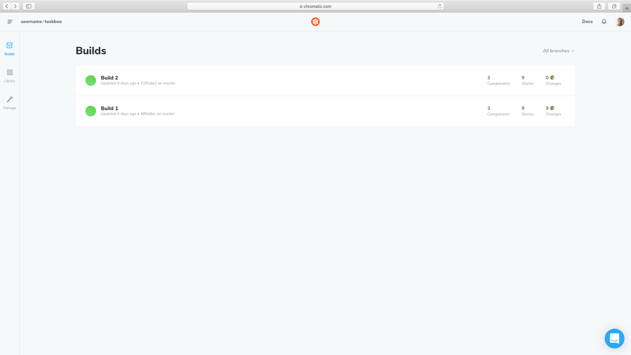 깃허브 action을 설정하면 코드를 push할 때마다 스토리북이 크로마틱에 배포될 것입니다. 크로마틱의 프로젝트 빌드 화면에서 배포된 모든 스토리북을 보실 수 있습니다.