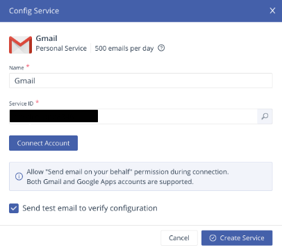 4. Create Service 버튼 클릭> 해당 이메일 계정에 로그인하는 창이 뜸>로그인하면 이메일 서비스 추가가 완료됨.