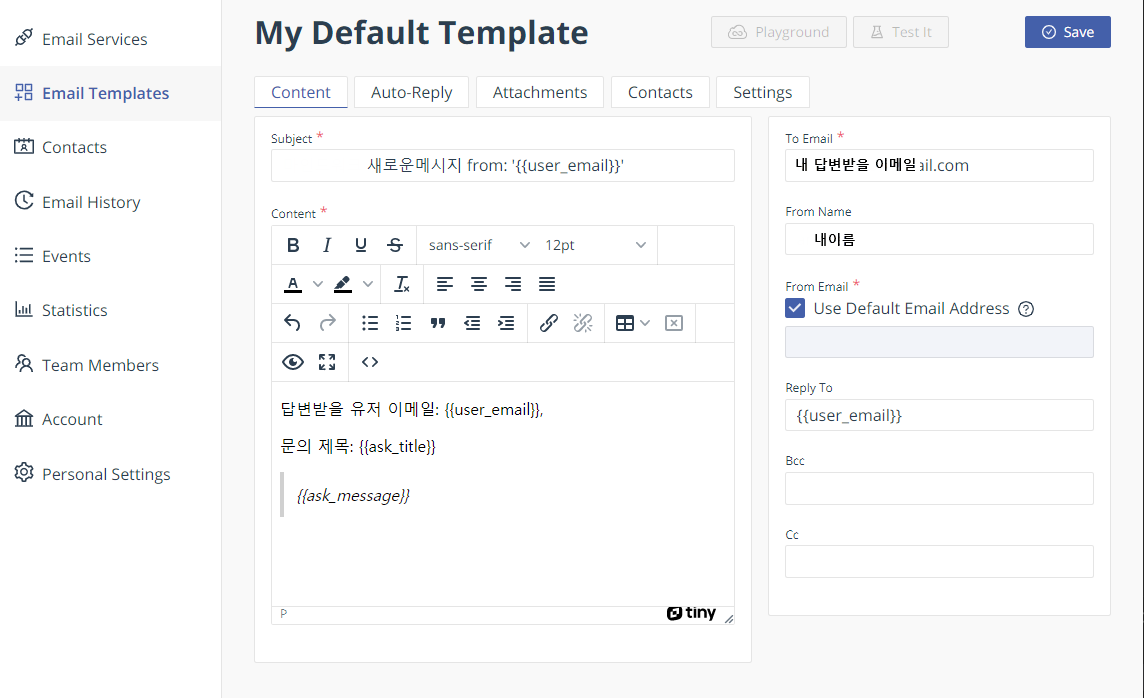 좌측 Email Templates 메뉴로 이동하여 템플릿을 작성한다. (나한테 오는 이메일을 어떻게 받는지 템플릿 정하는것임)나는 아래와 같이 작성했지만 마음대로 변경해서 사용하면 된다.