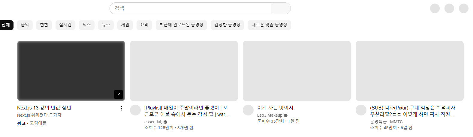 CSS와 JS를 사용하여 웹 페이지가 로딩될 때 스켈레톤 로딩화면(콘텐츠 모자이크)을 구현하는 방법에 대해 알아보겠습니다. Skeleton Screen 스켈레톤 스크린은 페이지 콘텐츠가 완전히 렌더링 되기