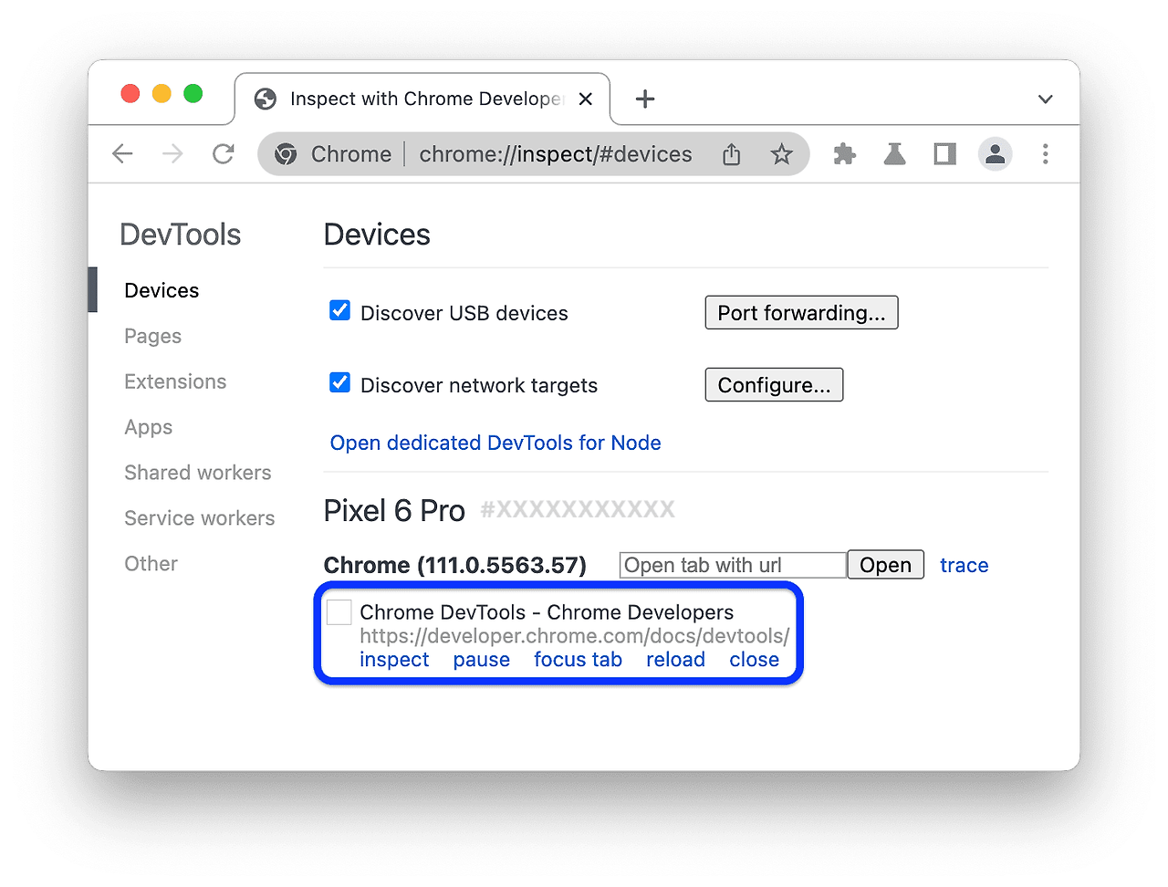 Android 기기에서 Chrome을 엽니다.- 개발 머신의 chrome://inspect/#devices에 Android 기기의 모델 이름과 일련번호가 표시됩니다. 그 아래에 기기에서 실행 중인 Chrome 버전이 표시되며 버전 번호가 괄호로 묶여 있습니다.