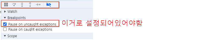 예외 발생 시, 멈추게 되는 기능이 켜져있었다.