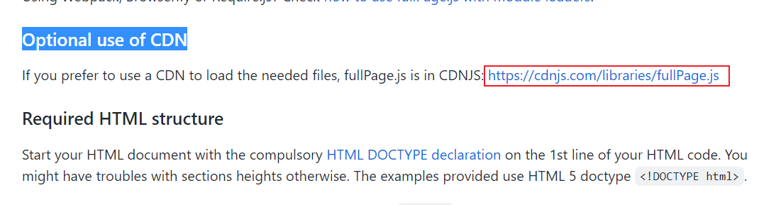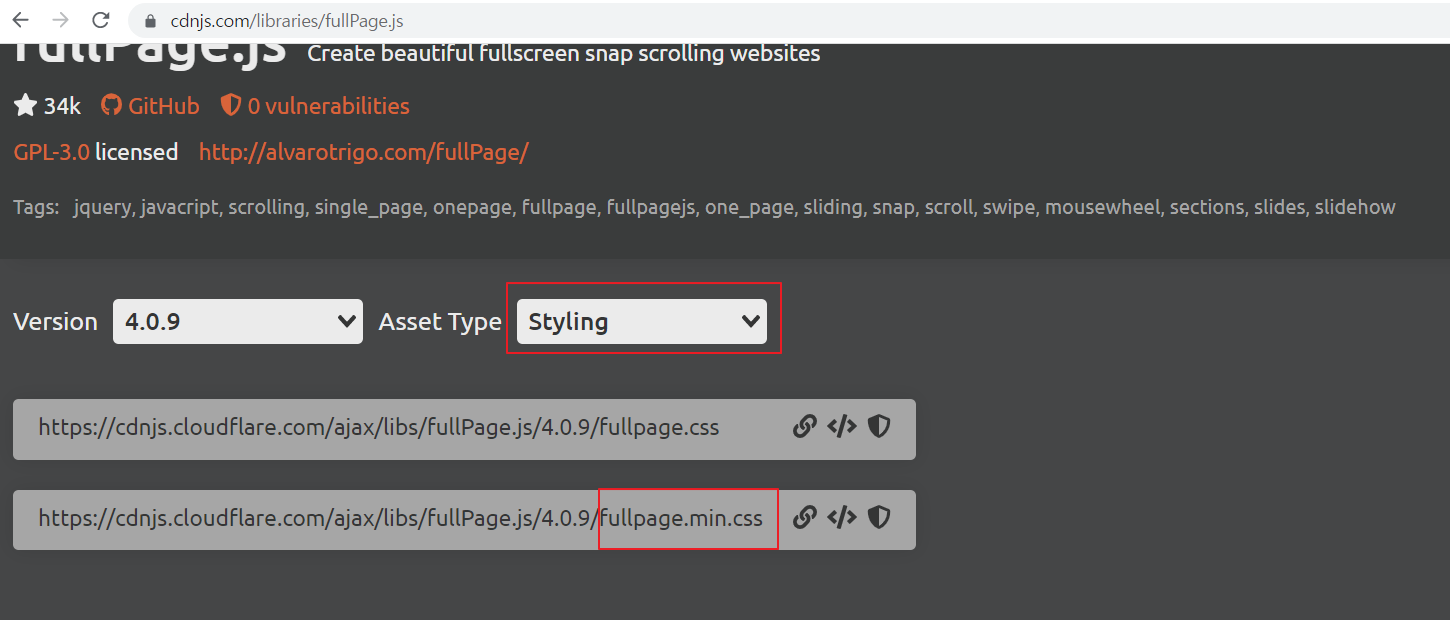 <link rel="stylesheet" href="https://cdnjs.cloudflare.com/ajax/libs/fullPage.js/4.0.9/fullpage.min.css" integrity="sha512-Go0fX6Al6Eab+N7QbSFHYBpwdcU2rbfONUcbRIS4z+9yzLlj7Xj8ao2BAOPE9Qtxdl+7iq04xzzcF4OTOWoUWg==" crossorigin="anonymous" referrerpolicy="no-referrer" />