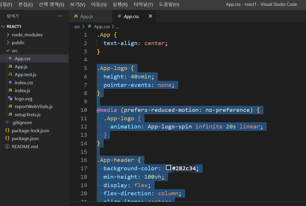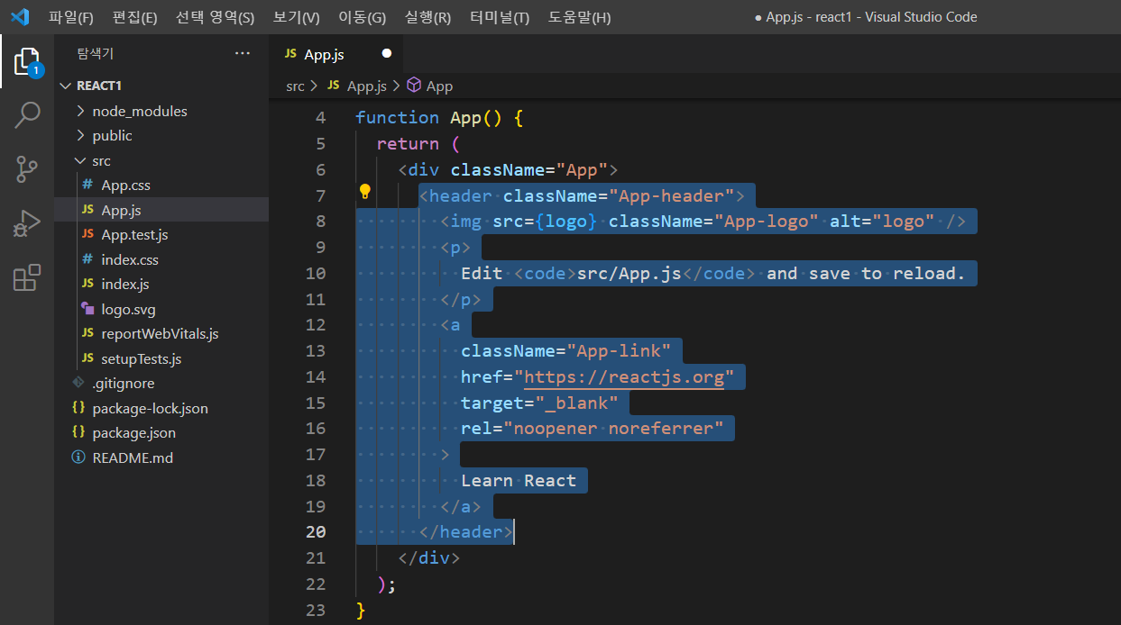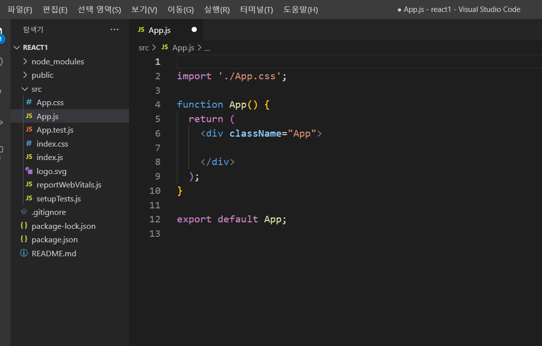 2. 왼쪽에 react생성한 파일을 선택후 react01 >src>app .js 선택후
