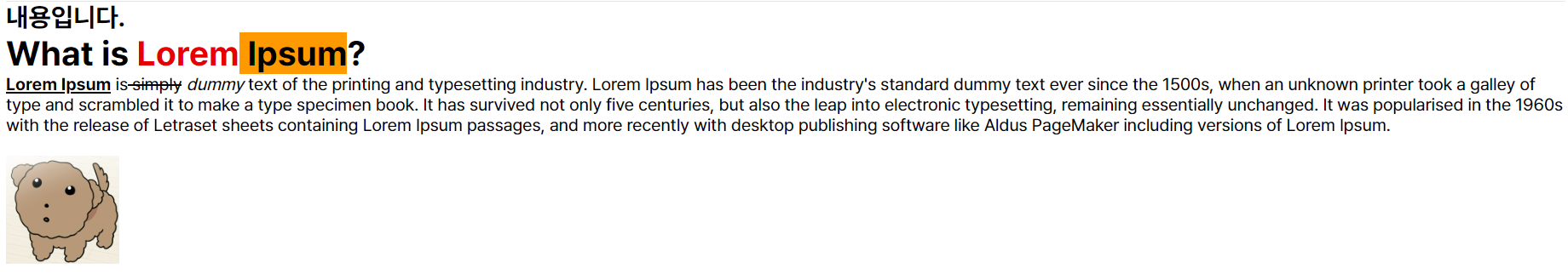 const dummyContent = `<h2>내용입니다.</h2><h1><span style="background-color: rgb(255, 255, 255); color: rgb(0, 0, 0); ">What is </span><span style="background - color: rgb(255, 255, 255); color: rgb(230, 0, 0); ">Lorem</span><span style="background - color: rgb(255, 153, 0); color: rgb(0, 0, 0); "> Ipsum</span><span style="background - color: rgb(255, 255, 255); color: rgb(0, 0, 0); ">?</span></h1><p><strong style="background - color: rgb(255, 255, 255); color: rgb(0, 0, 0); "><u>Lorem Ipsum</u></strong><span style="background - color: rgb(255, 255, 255); color: rgb(0, 0, 0); "> is</span><s style="background - color: rgb(255, 255, 255); color: rgb(0, 0, 0); "> simply</s><em style="background - color: rgb(255, 255, 255); color: rgb(0, 0, 0); "> dummy<a href="https://www.naver.com/" rel="noopener noreferrer" target="_blank"> </a></em><a href="https://www.naver.com/" rel="noopener noreferrer" target="_blank" style="background-color: rgb(255, 255, 255); color: rgb(0, 0, 0);">text </a><span style="background-color: rgb(255, 255, 255); color: rgb(0, 0, 0);">of the printing and typesetting industry. Lorem Ipsum has been the industry's standard dummy text ever since the 1500s, when an unknown printer took a galley of type and scrambled it to make a type specimen book. It has survived not only five centuries, but also the leap into electronic typesetting, remaining essentially unchanged. It was popularised in the 1960s with the release of Letraset sheets containing Lorem Ipsum passages, and more recently with desktop publishing software like Aldus PageMaker including versions of Lorem</span> Ipsum.</p><p><br></p><p><img src="https://img1.daumcdn.net/thumb/R1280x0.fjpg/?fname=http://t1.daumcdn.net/brunch/service/user/cnoC/image/66LHXQZY2bFLKR7SEO_KJjOnX6M" width="133" style=""></p><p><br></p><p><br></p>`
