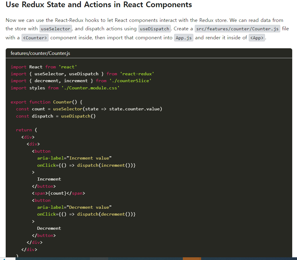 6. 사이트의 'Create a Redux State Slice' 를 참고하여 'counterSlice.js' 에 전체 복붙 후 수정하여 사용한다.